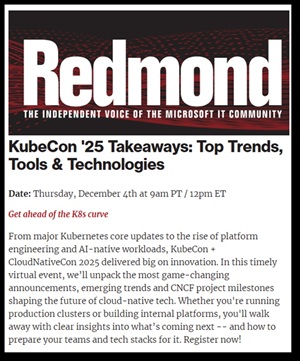 2025, I recently had the opportunity to present at a webinar sponsored by Redmond Magazine and 1105 Media (the parent company of Virtualization and Cloud Review), entitled "KubeCon '25 Takeaways: Top Trends, Tools & Technologies. It was a great event, and I had a lot of fun doing it. During my presentation, I discussed the key points I took away from KubeCon over the four days I attended it.