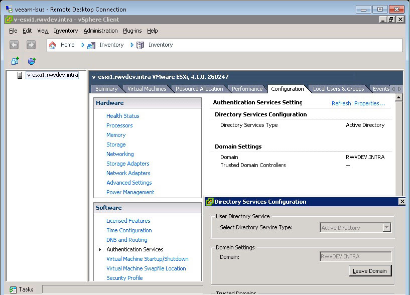 One of the most lauded features of vSphere 4.1 is the built-in Active Directory authentication engine for ESXi hosts. It's very easy to configure, and it works for both free ESXi installations as well as hosts managed by vCenter. The Active Directory-integrated security is configured in the Authentication Services section of each host (see Fig. 1).